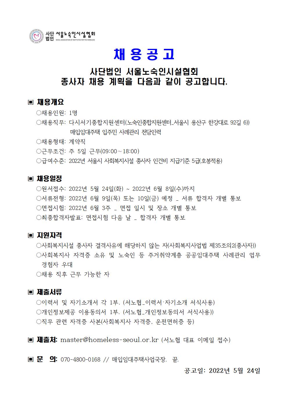 매입임대주택 사례관리자 채용 공고 관리자2022.05.24 09:58:51 조회2177 [서노협2022-5-24]매입임대주택 사례관리자 채용관련 서류(공고문, 표준이력서, 자기소개서, 개인정보동의서)001.jpg (144.03KB,325)[서노협2022-5-24]매입임대주택 사례관리자 채용관련 서류(공고문, 표준이력서, 자기소개서, 개인정보동의서).hwp (99.5KB,357) 목록 로그인 번호 제목 등록일 조회 59 서울특별시 시립영보자애원 민간위탁 수탁기관 모집 재공고 2024-06-21 1156 58 [안내] 인터콘티넨탈 서울 코엑스(호텔) 물품 배부 설명회 참석 및 홍보 요청 2024-06-20 762 57 [공유] 서울특별시 시립영보자애원 민간위탁 수탁기관 모집 공고 2024-05-08 1066 56 서울시 노숙인시설 종사자를 위한 이랜드「리프레쉬 투어」지원사업 신청접수 안내 2024-04-26 1610 55 [안내] 시립비전트레이닝센터 20주년 기념행사 오픈하우스&홈커밍데이 2024-04-25 932 54 [공유] 2024년 서울시 희망의 인문학 행복과정(시립대, 숭실대) 참여자 모집 안내 2024-04-08 901 53 [교육안내] 서울노숙인시설 종사자 "계약 종류·입찰 실무 교육" 신청안내입니다. 2024-03-29 823 52 [공유] 서울공동모금회 기능보강사업 안내해드립니다. 2024-03-11 1166 51 [공유] 서울공동모금회 소규모복지기관지원사업 안내해드립니다. 2024-02-29 1171 50 [공유] 서울시 2024년 [희망의 인문학] 프로그램 수행기관 공모 안내 2024-02-26 854 49 [공유] 2024년 노숙인시설 종사자 교육생 모집 안내 2024-02-16 1081 48 (보건복지부) 2024년 사회복지시설 관리안내 자료 2024-01-11 2330 47 제13대 서울노숙인시설협회 회장 선거 재공고 2023-12-18 1303 46 제13대 서울노숙인시설협회 회장 선거 공고 2023-12-01 2470 45 서울노숙인시설협회 사무처 직원채용 재공고 2023-11-27 760 12345678 제목 내용 제목+내용 댓글 이름 닉네임 아이디 검색
