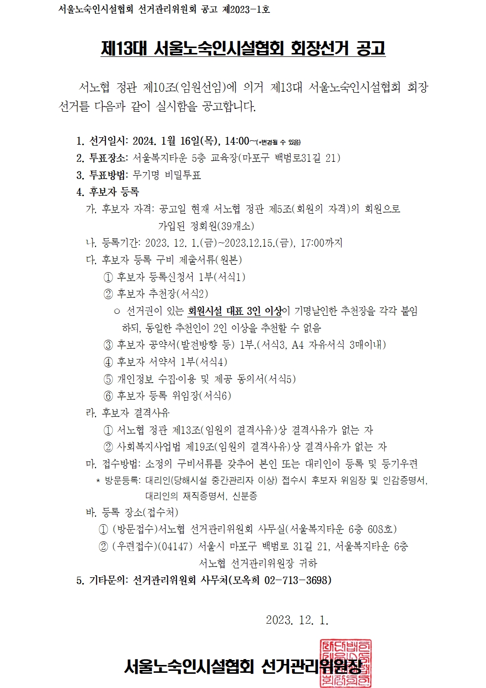 제13대 서울노숙인시설협회 회장 선거 공고 서노협 선거관리위원회2023.12.01 10:13:48 조회2470 [공고문] 13대 서노협회장 선거 공고문.jpg (610.7KB,161)[공고문] 13대 서노협회장 선거 공고문.pdf (87.72KB,202)[정회원명부] 13대 서노협회장 선거명부.pdf (67.4KB,224)(후보등록 서식) 제13대 서노협 회장 후보등록 구비서류(서식 6종].hwp (72.5KB,228) 목록 로그인 번호 제목 등록일 조회 59 서울특별시 시립영보자애원 민간위탁 수탁기관 모집 재공고 2024-06-21 1157 58 [안내] 인터콘티넨탈 서울 코엑스(호텔) 물품 배부 설명회 참석 및 홍보 요청 2024-06-20 762 57 [공유] 서울특별시 시립영보자애원 민간위탁 수탁기관 모집 공고 2024-05-08 1067 56 서울시 노숙인시설 종사자를 위한 이랜드「리프레쉬 투어」지원사업 신청접수 안내 2024-04-26 1610 55 [안내] 시립비전트레이닝센터 20주년 기념행사 오픈하우스&홈커밍데이 2024-04-25 932 54 [공유] 2024년 서울시 희망의 인문학 행복과정(시립대, 숭실대) 참여자 모집 안내 2024-04-08 902 53 [교육안내] 서울노숙인시설 종사자 "계약 종류·입찰 실무 교육" 신청안내입니다. 2024-03-29 824 52 [공유] 서울공동모금회 기능보강사업 안내해드립니다. 2024-03-11 1167 51 [공유] 서울공동모금회 소규모복지기관지원사업 안내해드립니다. 2024-02-29 1172 50 [공유] 서울시 2024년 [희망의 인문학] 프로그램 수행기관 공모 안내 2024-02-26 855 49 [공유] 2024년 노숙인시설 종사자 교육생 모집 안내 2024-02-16 1082 48 (보건복지부) 2024년 사회복지시설 관리안내 자료 2024-01-11 2332 47 제13대 서울노숙인시설협회 회장 선거 재공고 2023-12-18 1304 제13대 서울노숙인시설협회 회장 선거 공고 2023-12-01 2471 45 서울노숙인시설협회 사무처 직원채용 재공고 2023-11-27 760 12345678 제목 내용 제목+내용 댓글 이름 닉네임 아이디 검색