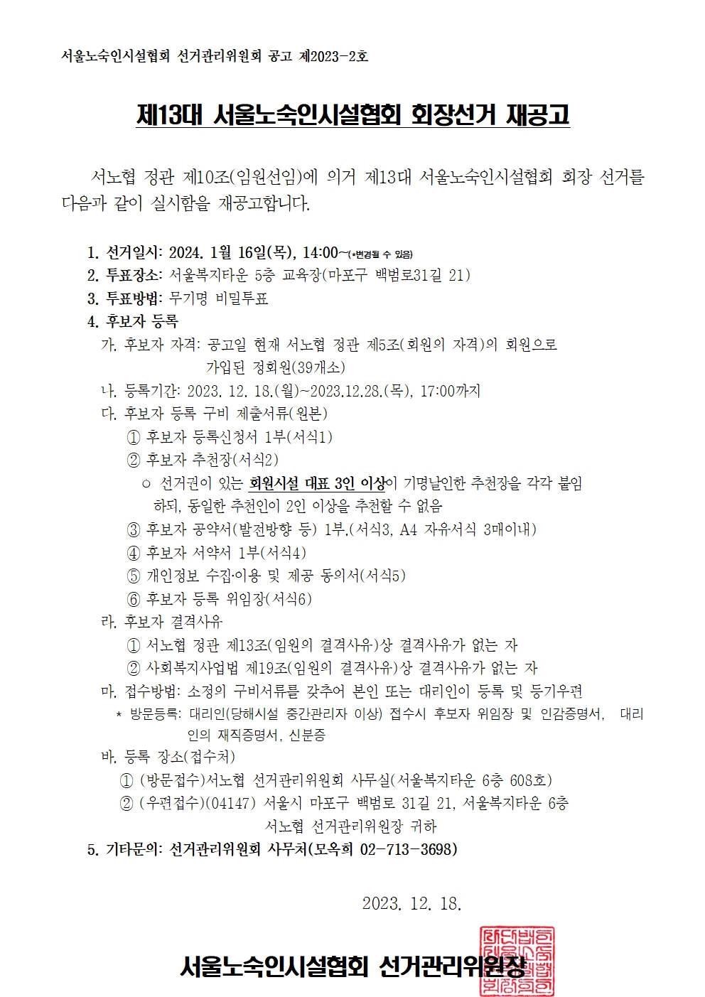 제13대 서울노숙인시설협회 회장 선거 재공고 서노협 선거관리위원회2023.12.18 10:49:31 조회1303 [1218재공고] 13대 서노협회장 선거재공고001.jpg (612.68KB,180)(1218 후보등록 서식) 제13대 서노협 회장 후보등록 구비서류(6종).hwp (72.5KB,189)[1218회원명부] 13대 서노협회장 선거 회원시설 명부.hwp (73.5KB,181) 목록 로그인 번호 제목 등록일 조회 59 서울특별시 시립영보자애원 민간위탁 수탁기관 모집 재공고 2024-06-21 1156 58 [안내] 인터콘티넨탈 서울 코엑스(호텔) 물품 배부 설명회 참석 및 홍보 요청 2024-06-20 762 57 [공유] 서울특별시 시립영보자애원 민간위탁 수탁기관 모집 공고 2024-05-08 1067 56 서울시 노숙인시설 종사자를 위한 이랜드「리프레쉬 투어」지원사업 신청접수 안내 2024-04-26 1610 55 [안내] 시립비전트레이닝센터 20주년 기념행사 오픈하우스&홈커밍데이 2024-04-25 932 54 [공유] 2024년 서울시 희망의 인문학 행복과정(시립대, 숭실대) 참여자 모집 안내 2024-04-08 902 53 [교육안내] 서울노숙인시설 종사자 "계약 종류·입찰 실무 교육" 신청안내입니다. 2024-03-29 824 52 [공유] 서울공동모금회 기능보강사업 안내해드립니다. 2024-03-11 1167 51 [공유] 서울공동모금회 소규모복지기관지원사업 안내해드립니다. 2024-02-29 1172 50 [공유] 서울시 2024년 [희망의 인문학] 프로그램 수행기관 공모 안내 2024-02-26 855 49 [공유] 2024년 노숙인시설 종사자 교육생 모집 안내 2024-02-16 1082 48 (보건복지부) 2024년 사회복지시설 관리안내 자료 2024-01-11 2332 제13대 서울노숙인시설협회 회장 선거 재공고 2023-12-18 1304 46 제13대 서울노숙인시설협회 회장 선거 공고 2023-12-01 2470 45 서울노숙인시설협회 사무처 직원채용 재공고 2023-11-27 760 12345678 제목 내용 제목+내용 댓글 이름 닉네임 아이디 검색