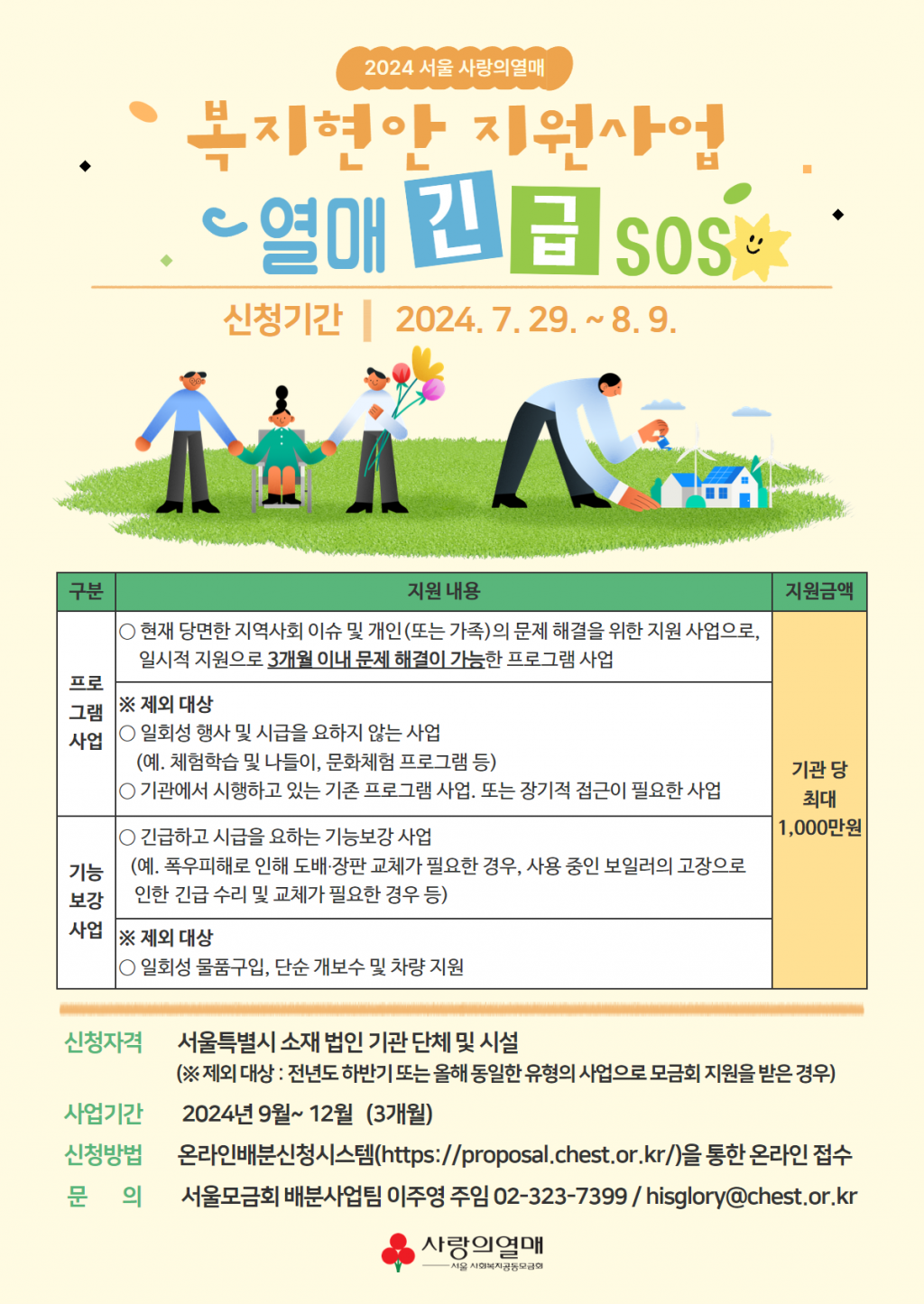 [공유] 서울사회복지공동모금회, 2024년 신청사업 '복지현안 지원사업:열매 긴급SOS'(1차) 안내 서울노숙인시설협회2024.08.02 10:27:35 조회835 서울 사회복지공동모금회에서는 '2024년 신청사업 복지현안 지원사업 : 열매 긴급 SOS(1차)' 사업을 공유하오니 관심있으신 시설에서는 공고문 등을 참고하여 신청하시기 바랍니다. ㅇ 사업개요 - 사업명: 2024년 신청사업 '복지현안 지원사업:열매 긴급SOS'(1차) 안내 - 사업목적: 기관 또는 지역사회의 긴급한 사회문제 해결 및 복지이슈 대응 - 신청기간: 2024.7.290(월)~2024.8.9.(금) 18:00 - 접수방법: 온라인배분신청사이트(사랑의 열매 (chest.or.kr))