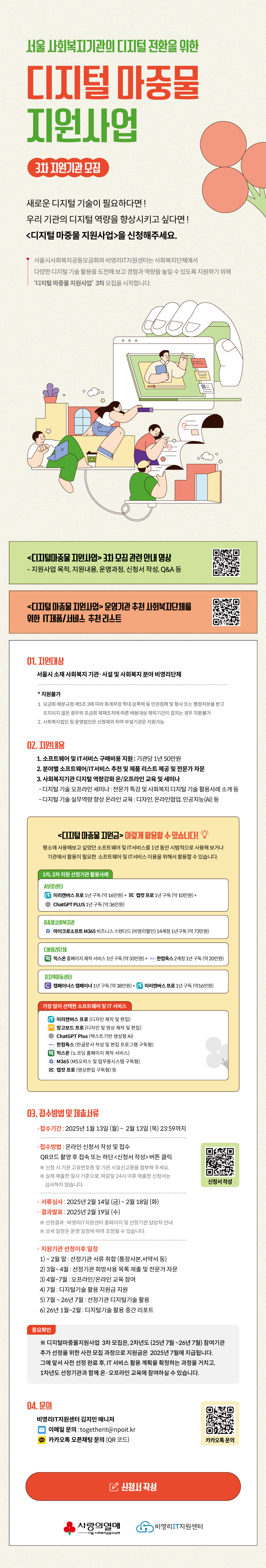 [공모안내] 서울 사회복지기관의 디지털전환을 위한 <디지털 마중물 지원사업> 안내 서울노숙인시설협회2025.01.20 11:23:15 조회608 서울사회복지공동모금회와 비영리IT지원센터에서는 서울 사회복지기관에서 다양한 디지털 기술을 접하고 활용할 수 있는 경험과 역량 향상을 위해 "디지털 마중물 지원사업"을 진행하고 있습니다. 관심있으신 시설에서는 공고문을 참고하여 신청하시기 바랍니다. 1. 사업명: 서울 사회복지기관의 디지털전환을 위한 "디지털 마중물 지원사업" 2. 접수기간: 2025.1.13(월)~2025.2.13.(목) 3. 지원내용 1) 기관당 디지털 서비스 구매 및 이용 위한 비용 지원 2) 디지털 기술분야 관련 전문가 추천 디지털 서비스 및 제품 리스트 제공 3) 사회복지기관 디지털 역량강화 온/오프라인 교육 및 세미나 4. 사업신청링크: https://www.npoit.kr/notice/?uid=582&mod=document&pageid=1