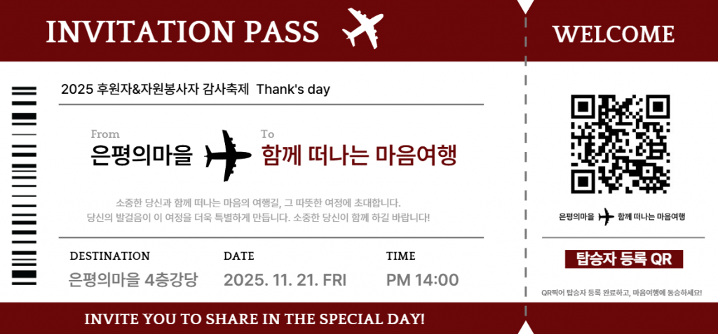 [홍보] 시립은평의마을 '2025 후원자&자원봉사자 감사축제' 개최 안내 서울노숙인시설협회2025.11.07 14:40:49 조회288 (초대장) 은평의마을 감사축제.png (273.59KB,19) 목록 로그인 번호 제목 등록일 조회 공지 [공고] 2025년 제18차 정기총회 개최 공고 2026-01-05 82 공지 [안내] 알기 쉬운 사회복지시설 운영 체크리스트(보건복지부) 2025-11-13 397 공지 [안내] 2026년 확정된 최저임금 알림_고용노동부 2025-10-15 561 공지 [신청안내] 서울시 노숙인시설 종사자를 위한 이랜드「리프레쉬 투어」지원사업 안내 2025-03-19 2417 공지 [사무처] 회원시설 종사자 조사(弔事) 지원 및 정년퇴임 공로패 증정 기준 안내 2021-05-10 6685 111 제14대 서울노숙인시설협회 회장 선거 재공고 2026-01-05 68 110 [안내] 열매에너지 ON 에너지효율개선 인프라 지원신청 안내(신청기간 연장) 2025-12-22 118 109 제14대 서울노숙인시설협회 회장 선거 재공고 2025-12-19 115 108 제14대 서울노숙인시설협회 회장 선거 공고 2025-12-04 152 [홍보] 시립은평의마을 '2025 후원자&자원봉사자 감사축제' 개최 안내 2025-11-07 289 106 서울특별시립 비전트레이닝센터 재위탁 수탁법인 공개모집 안내 2025-10-17 500 105 [안내] 서울시립 다시서기종합지원센터 재위탁 수탁법인 공개 모집 안내 2025-10-13 451 104 [교육신청안내] 노숙인시설 중간관리자 직무 역량 강화 교육 신청 안내 2025-10-01 432 103 [안내] 서울시사회복지협의회_제17회 2025 서울사회복지걷기대회 개최 및 참가 신청 안내 2025-09-26 451 102 [교육안내] 한국자활연수원 2025년 마지막 노숙인시설 대면 교육 안내 2025-09-26 301 12345678 제목 내용 제목+내용 댓글 이름 닉네임 아이디 검색