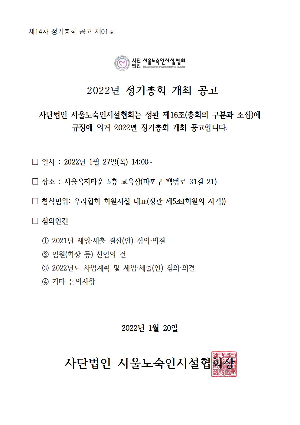 제14차 2022년도 사단법인 서울노숙인시설협회 정기총회 개최 공고 관리자2022.01.20 16:52:28 조회2123 [22 총회 공고]2022년 정기총회 공고001.jpg (97.89KB,345) 목록 로그인 번호 제목 등록일 조회 공지 [안내] 열매에너지 ON 에너지효율개선 인프라 지원신청 안내(신청기간 연장) 2025-12-22 72 공지 제14대 서울노숙인시설협회 회장 선거 재공고 2025-12-19 83 공지 [안내] 알기 쉬운 사회복지시설 운영 체크리스트(보건복지부) 2025-11-13 321 공지 [안내] 2026년 확정된 최저임금 알림_고용노동부 2025-10-15 450 공지 [신청안내] 서울시 노숙인시설 종사자를 위한 이랜드「리프레쉬 투어」지원사업 안내 2025-03-19 2352 공지 [사무처] 회원시설 종사자 조사(弔事) 지원 및 정년퇴임 공로패 증정 기준 안내 2021-05-10 6626 108 제14대 서울노숙인시설협회 회장 선거 공고 2025-12-04 121 107 [홍보] 시립은평의마을 '2025 후원자&자원봉사자 감사축제' 개최 안내 2025-11-07 243 106 서울특별시립 비전트레이닝센터 재위탁 수탁법인 공개모집 안내 2025-10-17 435 105 [안내] 서울시립 다시서기종합지원센터 재위탁 수탁법인 공개 모집 안내 2025-10-13 387 104 [교육신청안내] 노숙인시설 중간관리자 직무 역량 강화 교육 신청 안내 2025-10-01 400 103 [안내] 서울시사회복지협의회_제17회 2025 서울사회복지걷기대회 개최 및 참가 신청 안내 2025-09-26 420 102 [교육안내] 한국자활연수원 2025년 마지막 노숙인시설 대면 교육 안내 2025-09-26 270 101 [안내] 서울사회복지협의회_제26회 사회복지의 날 서울사회복지대회 행사 안내 2025-09-16 309 100 [안내] 서울시복지재단_2026년 서울형 사회복지시설(노숙인이용시설) 평가 전문위원 추가 모집 안내 2025-09-11 357 12345678 제목 내용 제목+내용 댓글 이름 닉네임 아이디 검색