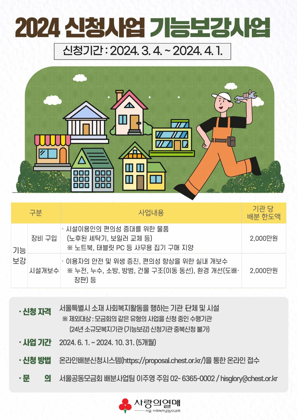 [공유] 서울공동모금회 기능보강사업 안내해드립니다. 서울노숙인시설협회2024.03.11 13:27:03 조회1082 서울 공동모금회에서는 '2024년 기능보강사업'을 아래와 같이 시행하오니 회원시설에서는 업무에 참고하여 주시기 바랍니다. o 기능보강사업 개요 - 신청기간: 2024.3.4.(월)~2024.4.1.(월), 18:00 - 접수방법: 온라인 신청만 가능(http://proposal.chest.or.kr) - 문의: 배분사업팀 02-6365-0002 1- 2024신청사업(기능보강)공고문.hwp (48KB,188)2- 2024 신청사업(기능보강) 홍보포스터.jpg (809.47KB,153) 목록 로그인 번호 제목 등록일 조회 공지 [안내] 열매에너지 ON 에너지효율개선 인프라 지원신청 안내(신청기간 연장) 2025-12-22 72 공지 제14대 서울노숙인시설협회 회장 선거 재공고 2025-12-19 83 공지 [안내] 알기 쉬운 사회복지시설 운영 체크리스트(보건복지부) 2025-11-13 321 공지 [안내] 2026년 확정된 최저임금 알림_고용노동부 2025-10-15 450 공지 [신청안내] 서울시 노숙인시설 종사자를 위한 이랜드「리프레쉬 투어」지원사업 안내 2025-03-19 2352 공지 [사무처] 회원시설 종사자 조사(弔事) 지원 및 정년퇴임 공로패 증정 기준 안내 2021-05-10 6626 108 제14대 서울노숙인시설협회 회장 선거 공고 2025-12-04 121 107 [홍보] 시립은평의마을 '2025 후원자&자원봉사자 감사축제' 개최 안내 2025-11-07 243 106 서울특별시립 비전트레이닝센터 재위탁 수탁법인 공개모집 안내 2025-10-17 435 105 [안내] 서울시립 다시서기종합지원센터 재위탁 수탁법인 공개 모집 안내 2025-10-13 387 104 [교육신청안내] 노숙인시설 중간관리자 직무 역량 강화 교육 신청 안내 2025-10-01 400 103 [안내] 서울시사회복지협의회_제17회 2025 서울사회복지걷기대회 개최 및 참가 신청 안내 2025-09-26 420 102 [교육안내] 한국자활연수원 2025년 마지막 노숙인시설 대면 교육 안내 2025-09-26 270 101 [안내] 서울사회복지협의회_제26회 사회복지의 날 서울사회복지대회 행사 안내 2025-09-16 309 100 [안내] 서울시복지재단_2026년 서울형 사회복지시설(노숙인이용시설) 평가 전문위원 추가 모집 안내 2025-09-11 357 12345678 제목 내용 제목+내용 댓글 이름 닉네임 아이디 검색