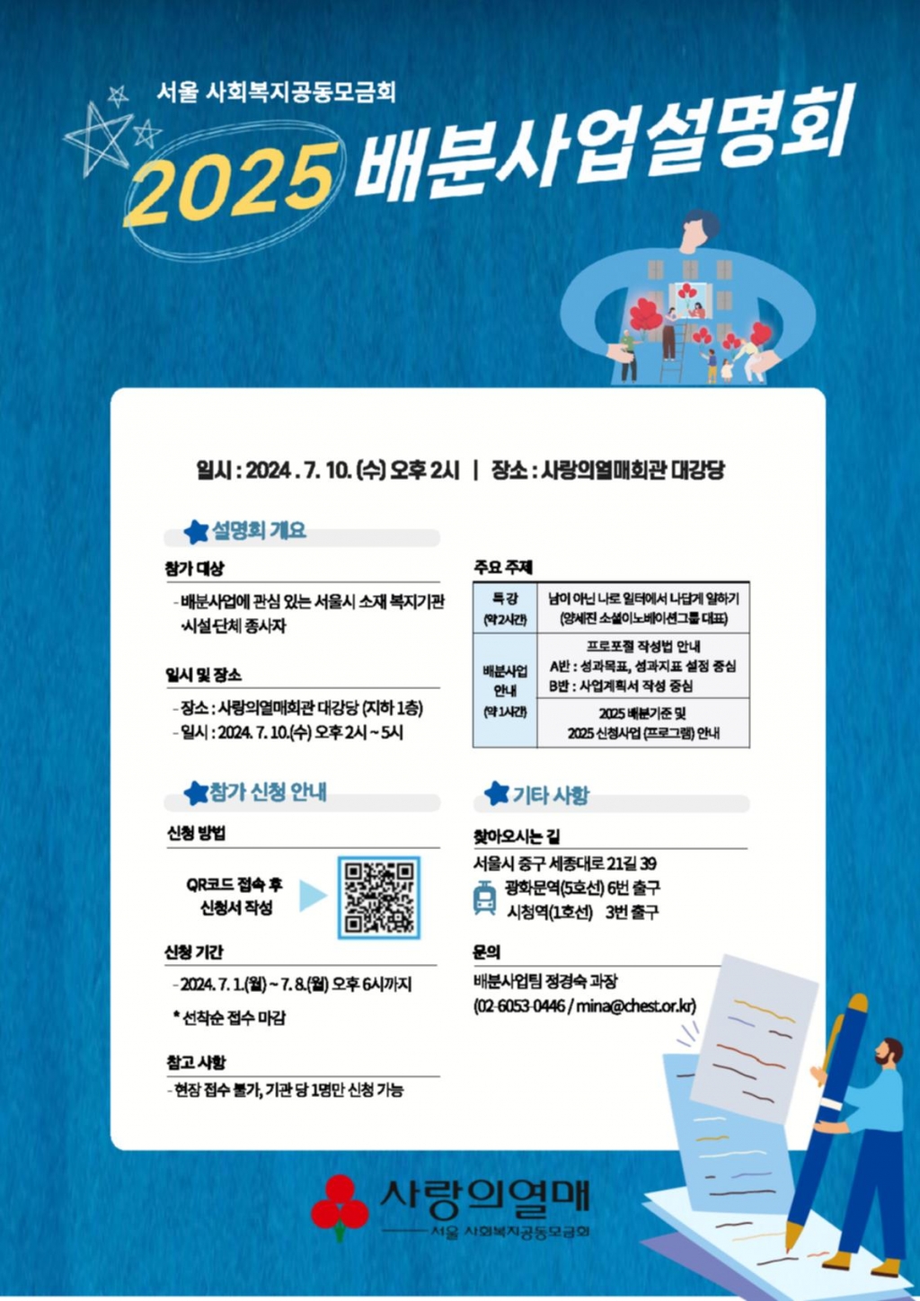 [공유] 서울 사회복지공동모금회 2025년 배분사업설명회 안내해드립니다. 서울노숙인시설협회2024.07.03 09:50:34 조회759 2-2025년 배분사업설명회 안내 포스터.jpg (715.65KB,89) 목록 로그인 번호 제목 등록일 조회 공지 제14대 서울노숙인시설협회 회장 선거 공고 2025-12-04 31 공지 [안내] 알기 쉬운 사회복지시설 운영 체크리스트(보건복지부) 2025-11-13 184 공지 [안내] 2026년 확정된 최저임금 알림_고용노동부 2025-10-15 306 공지 [신청안내] 서울시 노숙인시설 종사자를 위한 이랜드「리프레쉬 투어」지원사업 안내 2025-03-19 2125 공지 [사무처] 회원시설 종사자 조사(弔事) 지원 및 정년퇴임 공로패 증정 기준 안내 2021-05-10 6544 107 [홍보] 시립은평의마을 '2025 후원자&자원봉사자 감사축제' 개최 안내 2025-11-07 172 106 서울특별시립 비전트레이닝센터 재위탁 수탁법인 공개모집 안내 2025-10-17 325 105 [안내] 서울시립 다시서기종합지원센터 재위탁 수탁법인 공개 모집 안내 2025-10-13 293 104 [교육신청안내] 노숙인시설 중간관리자 직무 역량 강화 교육 신청 안내 2025-10-01 340 103 [안내] 서울시사회복지협의회_제17회 2025 서울사회복지걷기대회 개최 및 참가 신청 안내 2025-09-26 366 102 [교육안내] 한국자활연수원 2025년 마지막 노숙인시설 대면 교육 안내 2025-09-26 215 101 [안내] 서울사회복지협의회_제26회 사회복지의 날 서울사회복지대회 행사 안내 2025-09-16 262 100 [안내] 서울시복지재단_2026년 서울형 사회복지시설(노숙인이용시설) 평가 전문위원 추가 모집 안내 2025-09-11 308 99 [홍보] 인정복지재단 만나샘 창립 20주년 기념 행사 안내 2025-09-10 257 98 [안내] 서울공동모금회_ ‘열매똑똑오피스’ 지원사업 안내 2025-09-04 354 12345678 제목 내용 제목+내용 댓글 이름 닉네임 아이디 검색