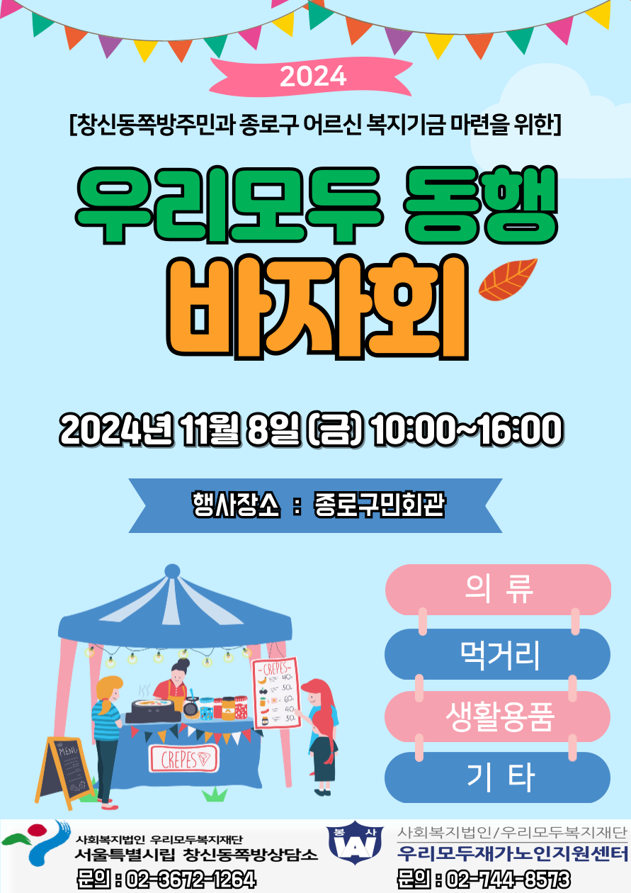 [홍보] 시립창신동쪽방상담소 "우리모두 동행" 바자회 개최 안내 서울노숙인시설협회2024.10.30 15:16:26 조회570 시립창신동쪽방상담소 바자회 개최 포스터.png (275.76KB,103) 목록 로그인 번호 제목 등록일 조회 공지 제14대 서울노숙인시설협회 회장 선거 재공고 2026-01-05 25 공지 [공고] 2025년 제18차 정기총회 개최 공고 2026-01-05 24 공지 [안내] 열매에너지 ON 에너지효율개선 인프라 지원신청 안내(신청기간 연장) 2025-12-22 81 공지 [안내] 알기 쉬운 사회복지시설 운영 체크리스트(보건복지부) 2025-11-13 332 공지 [안내] 2026년 확정된 최저임금 알림_고용노동부 2025-10-15 466 공지 [신청안내] 서울시 노숙인시설 종사자를 위한 이랜드「리프레쉬 투어」지원사업 안내 2025-03-19 2362 공지 [사무처] 회원시설 종사자 조사(弔事) 지원 및 정년퇴임 공로패 증정 기준 안내 2021-05-10 6635 109 제14대 서울노숙인시설협회 회장 선거 재공고 2025-12-19 91 108 제14대 서울노숙인시설협회 회장 선거 공고 2025-12-04 125 107 [홍보] 시립은평의마을 '2025 후원자&자원봉사자 감사축제' 개최 안내 2025-11-07 251 106 서울특별시립 비전트레이닝센터 재위탁 수탁법인 공개모집 안내 2025-10-17 445 105 [안내] 서울시립 다시서기종합지원센터 재위탁 수탁법인 공개 모집 안내 2025-10-13 399 104 [교육신청안내] 노숙인시설 중간관리자 직무 역량 강화 교육 신청 안내 2025-10-01 404 103 [안내] 서울시사회복지협의회_제17회 2025 서울사회복지걷기대회 개최 및 참가 신청 안내 2025-09-26 422 102 [교육안내] 한국자활연수원 2025년 마지막 노숙인시설 대면 교육 안내 2025-09-26 271 12345678 제목 내용 제목+내용 댓글 이름 닉네임 아이디 검색