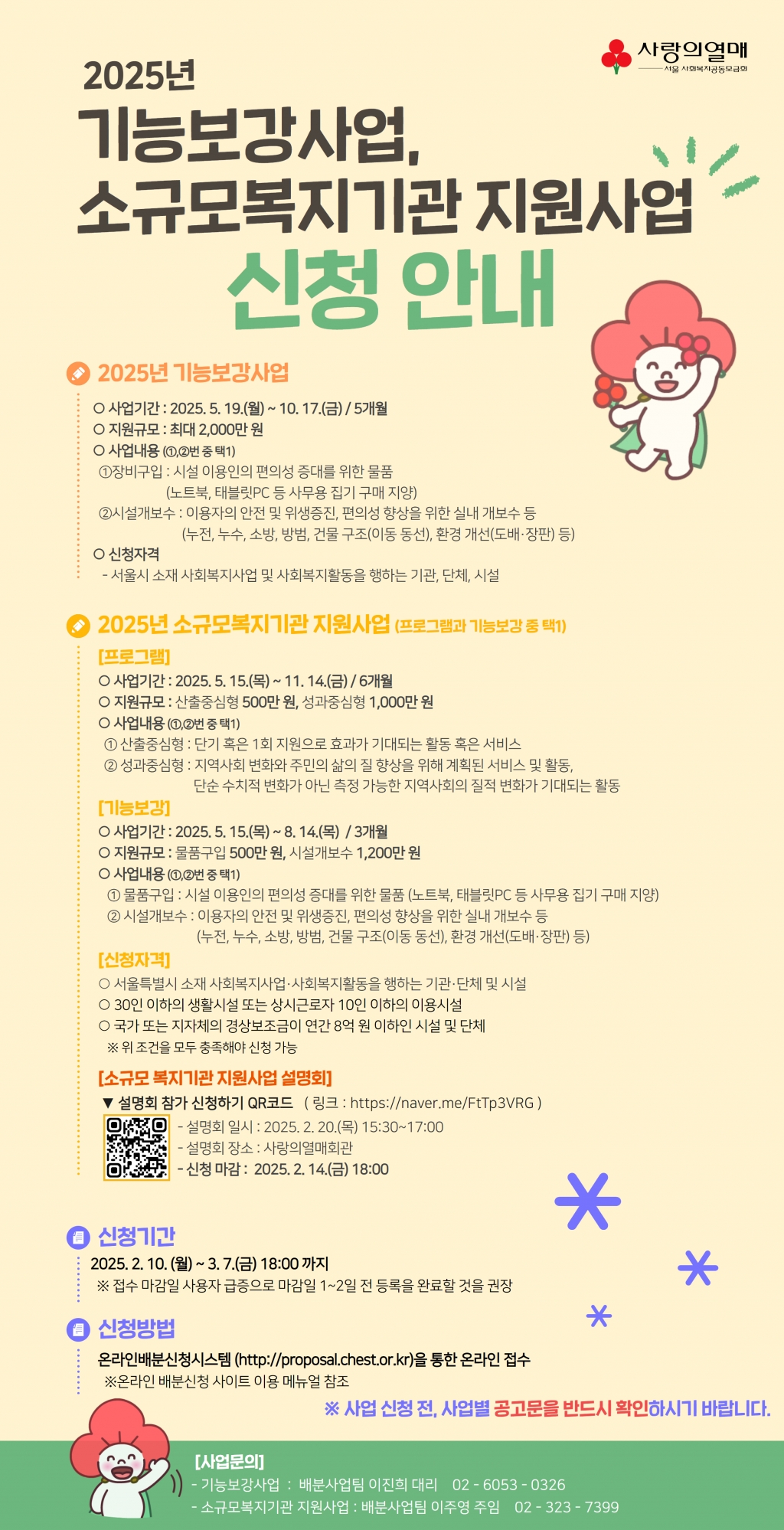 [안내] 서울공동모금회 2025년 신청사업(기능보강 및 소규모 복지기관 지원사업) 서울노숙인시설협회2025.02.07 16:04:39 조회669 서울 모금회에서는 "2025년 신청사업(기능보강 및 소규모 복지기관 지원사업)" 공고 중에 있습니다. 관심있으신 시설에서는 공고문을 참고하여 신청하시기 바랍니다. ㅇ 신청개요 - 신청기간 : 2025. 2. 10.(월) ~ 2025. 3. 7.(금) 18:00까지 - 신청방법 : 온라인배분신청사이트(https://proposal.chest.or.kr/)를 통한 온라인 접수