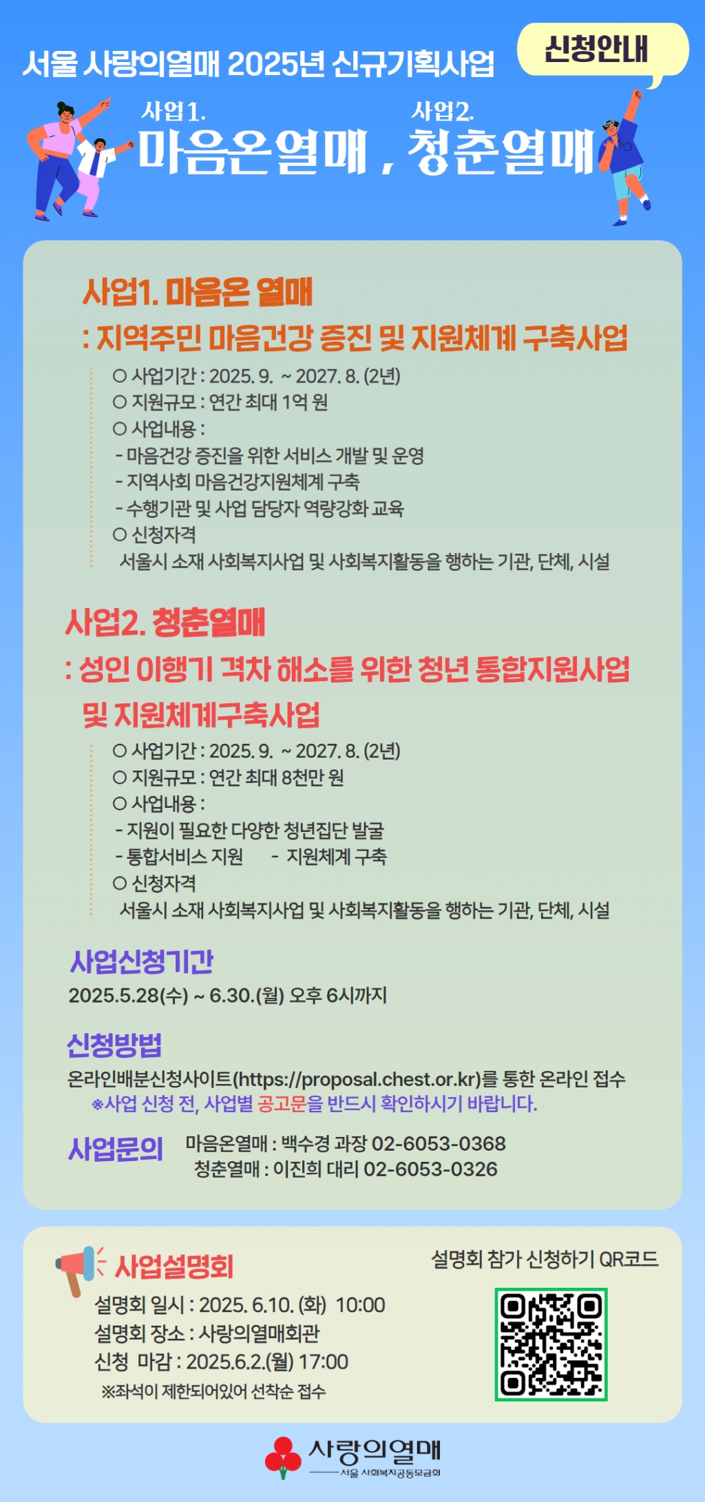 [안내] 서울공동모금회 2025년 신규기획사업-마음온열매(마음건강), 청년열매(청년) 공모 안내 서울노숙인시설협회2025.05.28 13:23:08 조회552 ㅇ 서울사랑의열매 사업안내: 바로가기