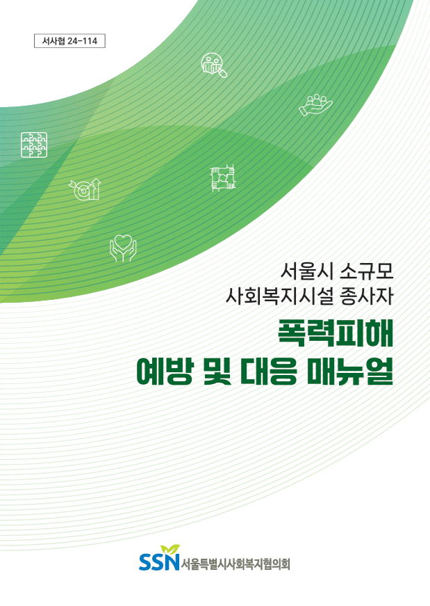 [공유] 서울시 소규모 사회복지시설 종사자 폭력피해 예방 및 대응 매뉴얼 관리자2025.01.20 11:03:23 조회958 서울특별시사회복지협의회에서 발행된 서울시 소규모 사회복지시설 종사자 폭력피해 예방 및 대응 매뉴얼 입니다. 회원시설에서는 업무에 참고하여 주시기 바랍니다. 출처: 서울특별시사회복지협의회 연구보고서